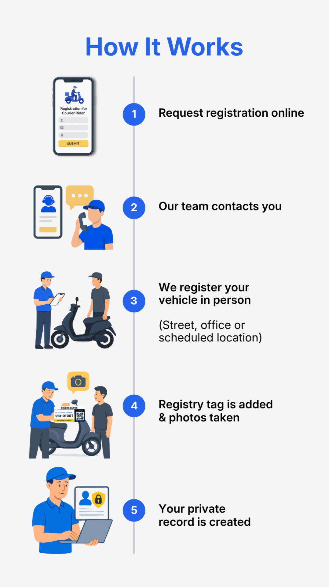 What RiderStatus IsRiderStatus is a voluntary record-keeping service for delivery vehicles.We create dated records of vehicles and equipment when they are registered in person.RiderStatus is not a licence, insurance, enforcement authority, or delivery platform.